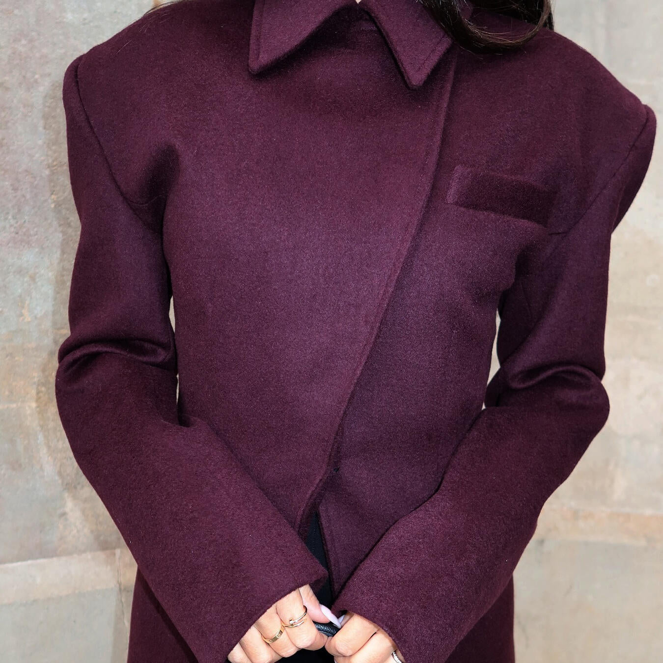 This women’s blazer is a stylish and practical outerwear piece. It features an asymmetric front design that adds a modern touch, along with structured lapels and chest pockets for a classic look. Made from a dense wool – blend material, it offers warmth suitable for cooler fall and winter days.