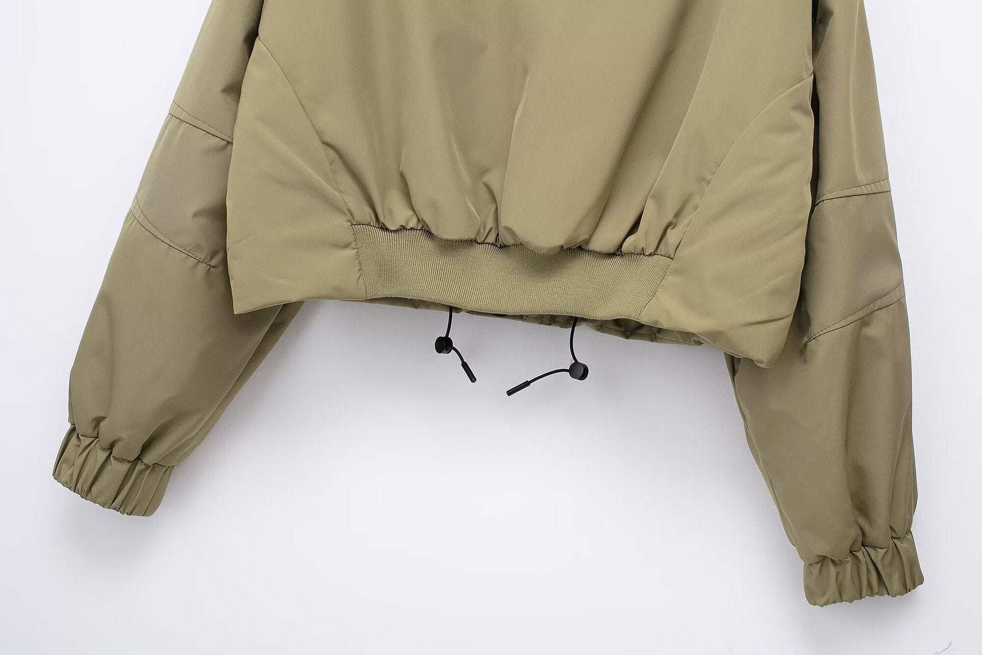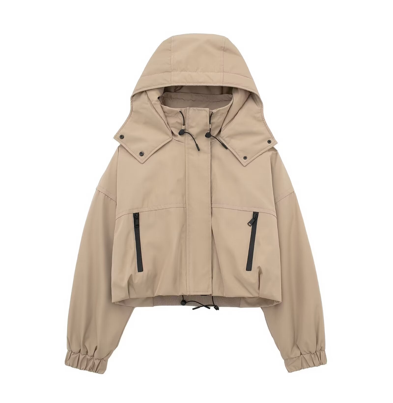 This is a stylish and practical cropped hooded jacket, perfect for transitional weather. It has a structured and casual design with paneled seams. The smooth, lightweight synthetic outer fabric provides water – repellent or windproof properties, while the soft inner lining ensures comfort and breathability.