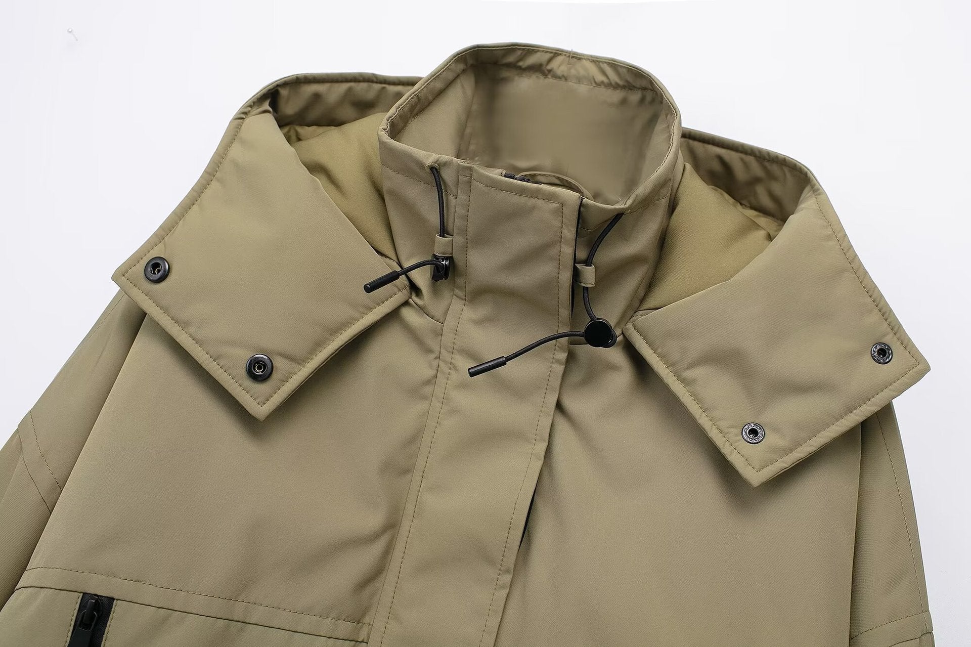 - Adjustable hood with drawstring and buttoned shoulder flaps for customizable coverage