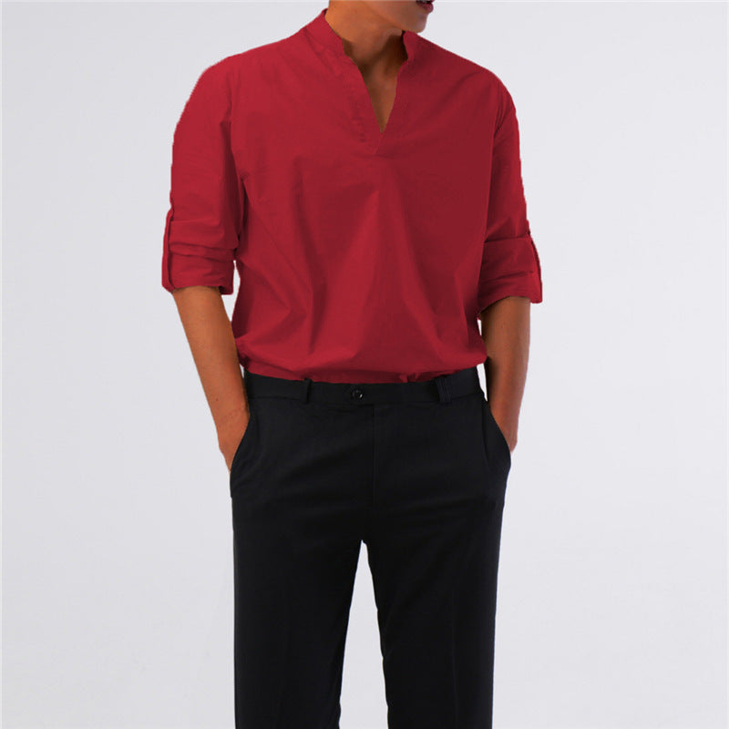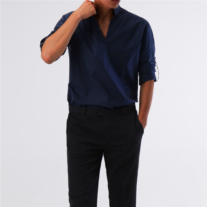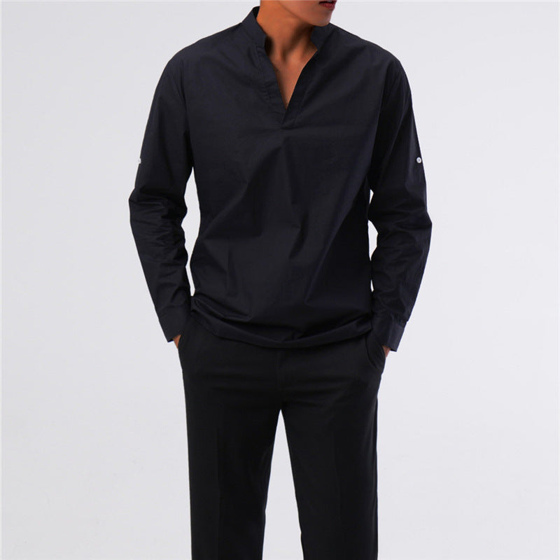 This men’s long – sleeved shirt is a versatile piece suitable for multiple occasions. Made of a smooth, lightweight cotton blend, it has a semi – stand – up collar with a V – neck cutout and a subtle buttoned placket. The shirt comes in a relaxed, boxy fit with clean lines and is available in several solid colors.