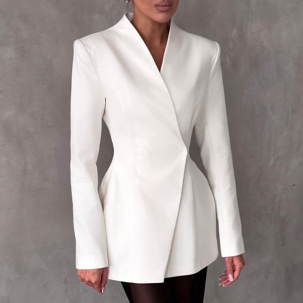 This is a structured women’s blazer designed for formal or semi – formal occasions. It features a solid white color and sophisticated silhouette. The blazer has structured shoulders, a fitted waist, and asymmetric lapel overlap, providing a modern and polished look.