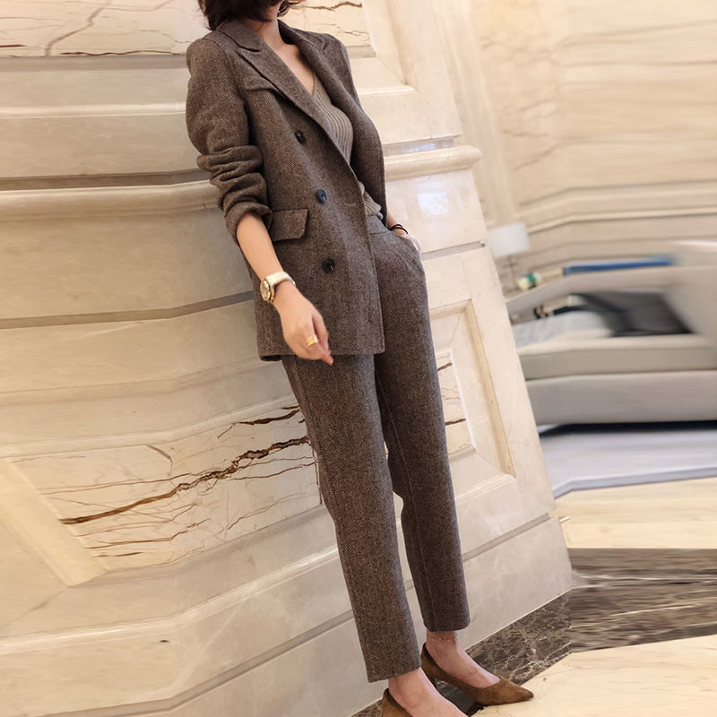 Herringbone-pattern Double-breasted Women’s Suit Set